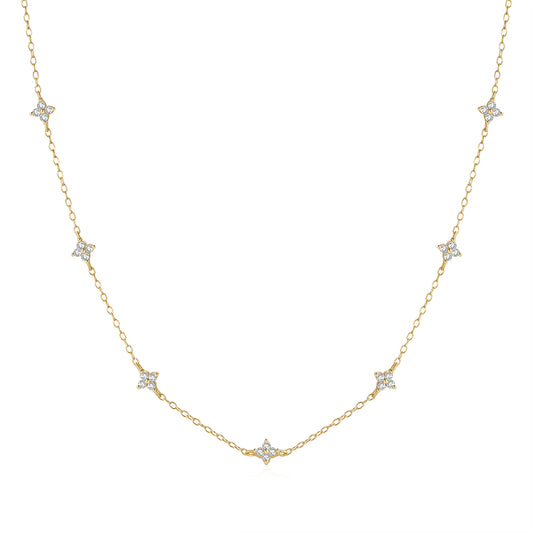 925 Silver Sterling 4 Star Flower Shiny Crystal Drop Necklace choker